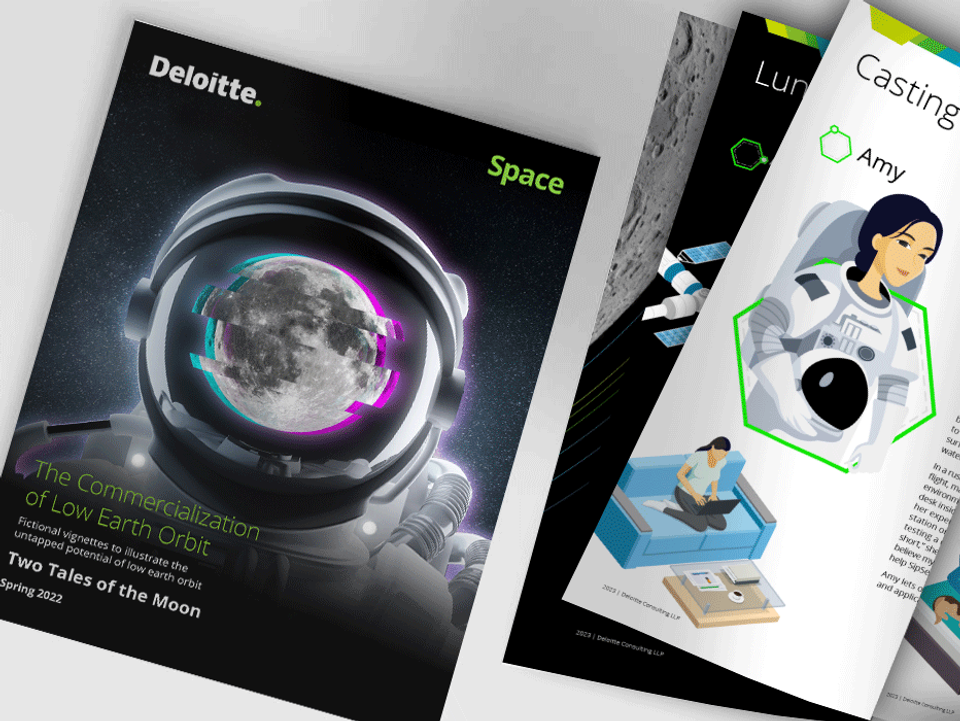 Concept and layout design for a speculative fiction perspective created to support a flagship SpaceTech report. This fictional narrative explores space through a combination of storytelling, in-depth research, and insights into the Commercial Space Sector